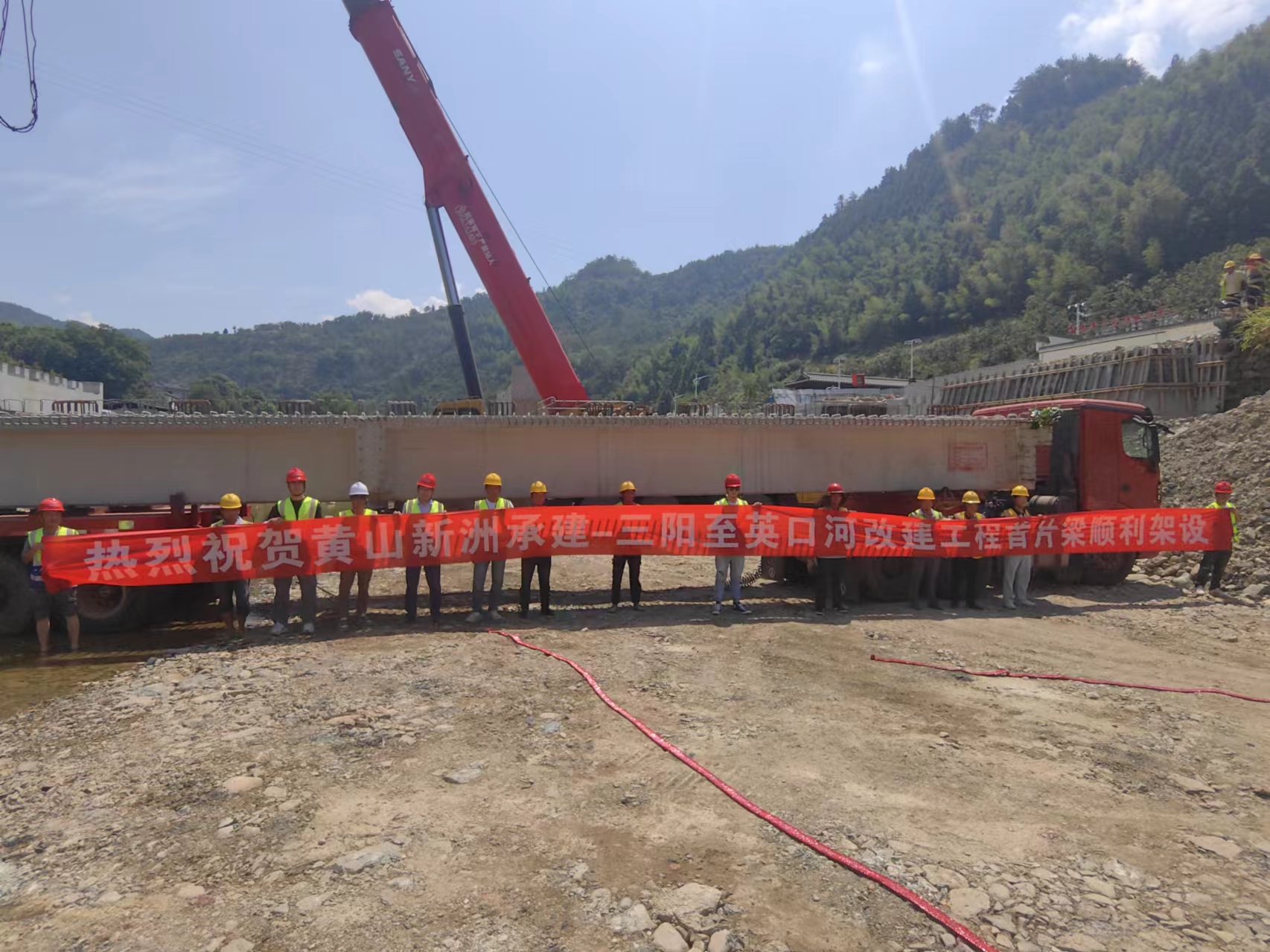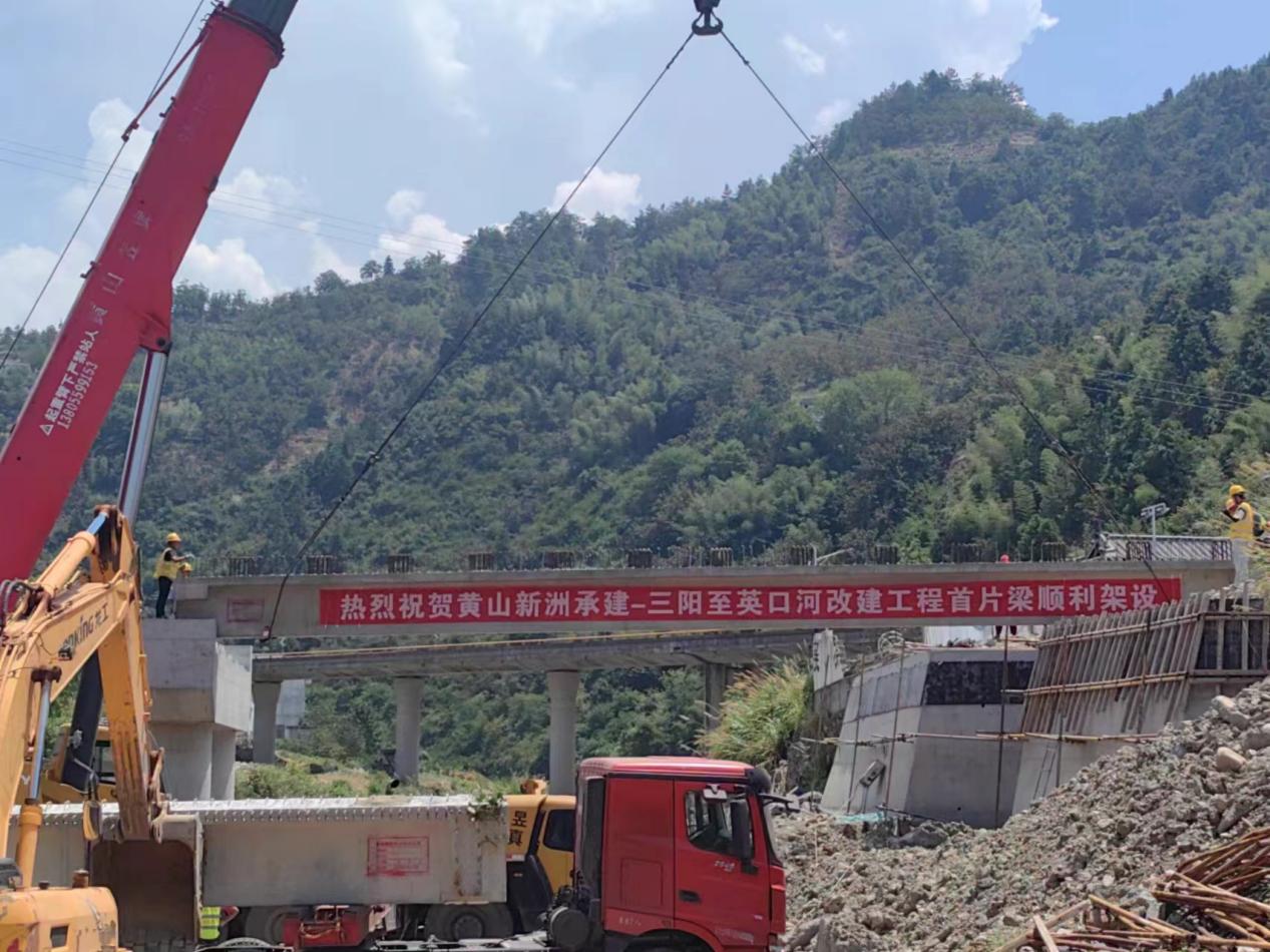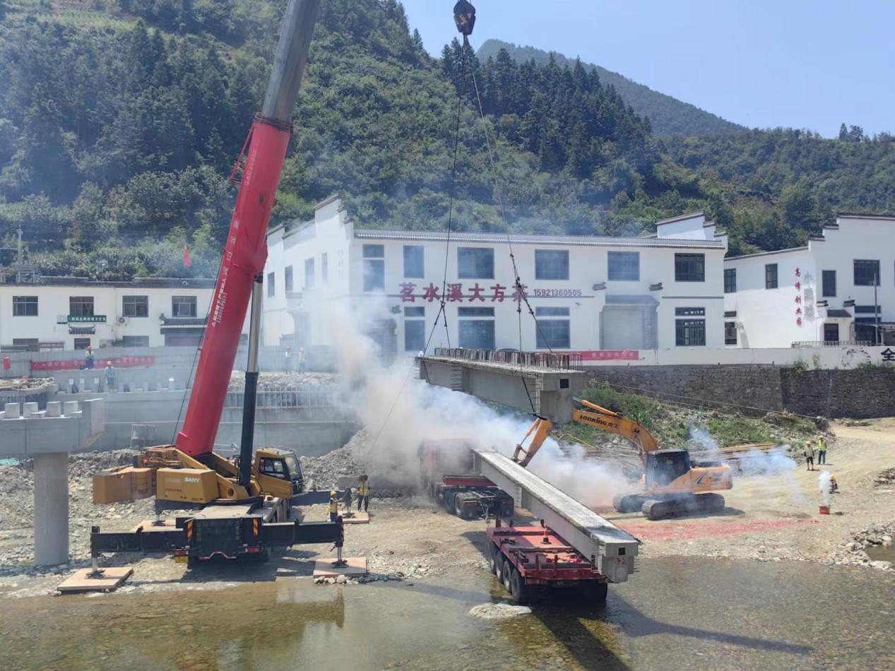 連日的持續(xù)高溫擋不住筑路人的步伐,8月5日上午,炎炎烈日之下,隨著煙花爆竹的一聲聲爆炸,我公司承建的歙縣三陽-英坑河口農(nóng)村道路改建工程,K1+148線外橋第一片梁板架設成功。